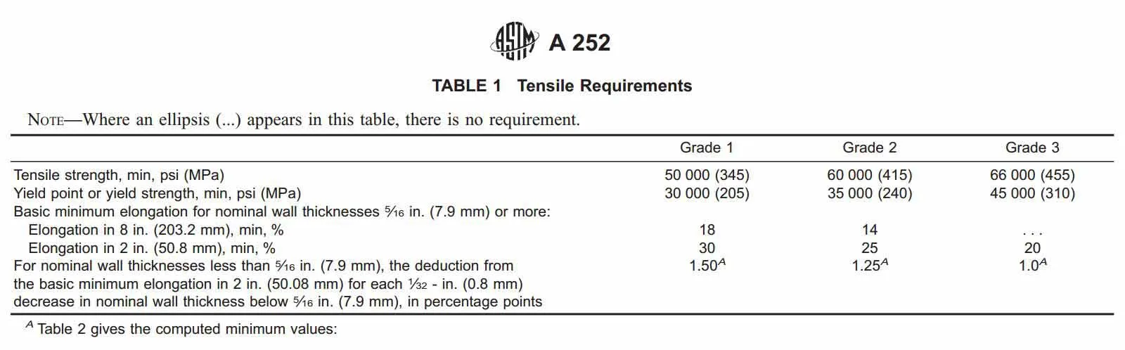 Según la resistencia a la tracción y el límite elástico, la norma ASTM A252 se clasifica en tres categorías/grados: